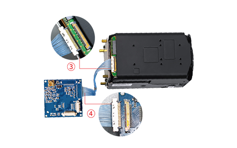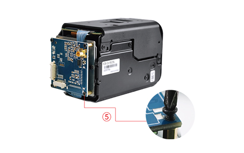 StepⅠ: 1. Install four copper pillars onto the iron plate (as shown in Figure ① above). 2. Install the iron plate onto the rear of the camera and tighten the screws (as shown in Figure ② above). | StepⅡ: 3. Connect one terminal of the LVDS coaxial cable to the HD block camera (as shown in Figure ③ above). 4. Connect the other terminal of the LVDS coaxial cable to the 3G-SDI interface board (as shown in Figure ④ above). Note: Plug in the LVDS coaxial cable with gold-plated pins on connectors facing up. Reverse insertion is strictly prohibited. | Step Ⅲ: 5. Install the 3G-SDI interface board to the rear of the camera and tighten the screws (as shown in Figure ⑤ above). |