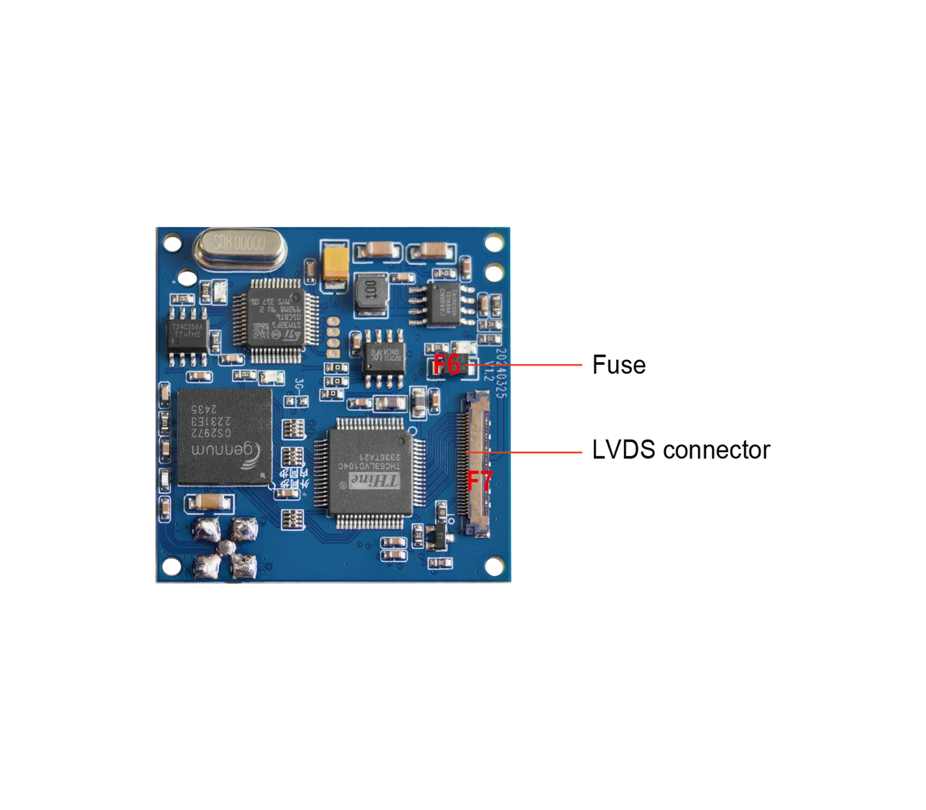 F7. LVDS connector: Used for connecting to the LVDS interface of the camera to achieve stable connection and signal transmission.